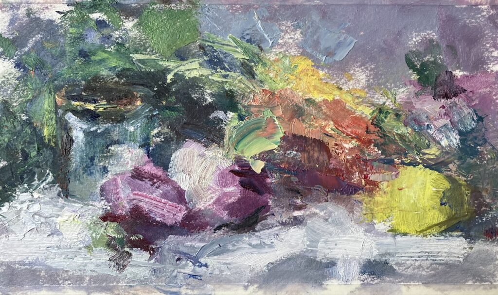 と、この後、いきなりキャンバスに描く前に、まずは、ハガキ2枚分くらいの大きさの紙に、油彩で構図と色合いを見ます。