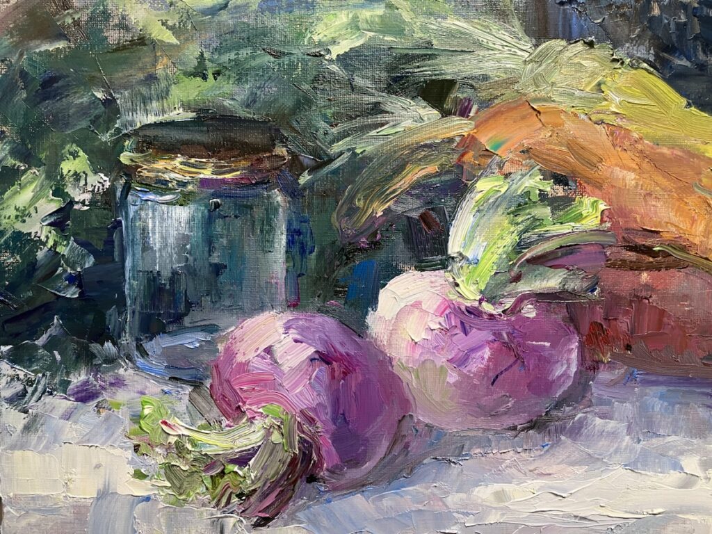 紫かぶもにんじんも、もう食べちゃってないので、あとは画面の中で色彩構成や筆致バランスとか、全体の調和を感じながら、もう一仕事ねばって、かっこいい絵を目指します。