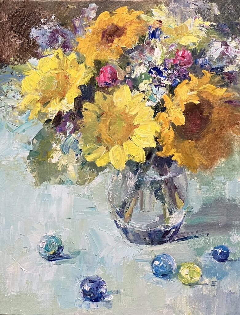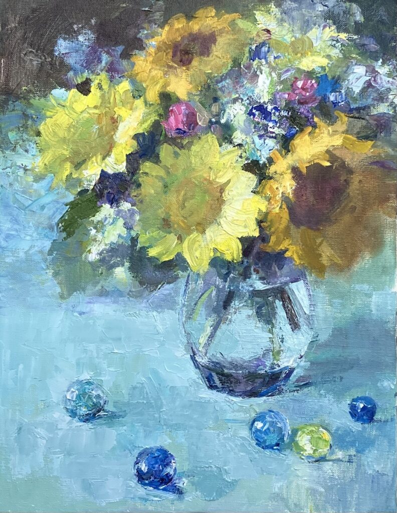 完成の作品が爽やかなブルーの色調で、プールの底やビー玉と共にラムネを感じさせたり清涼感満載なのに比して、2枚目はまだ暑さが残る初秋の日差しを感じたり、3枚目はどこか暖かい春先を感じたり…多分どれも向日葵を通じての佐恵美さんの思いの断片なのだな…(向日葵だけに春先はないですけどね)と。
