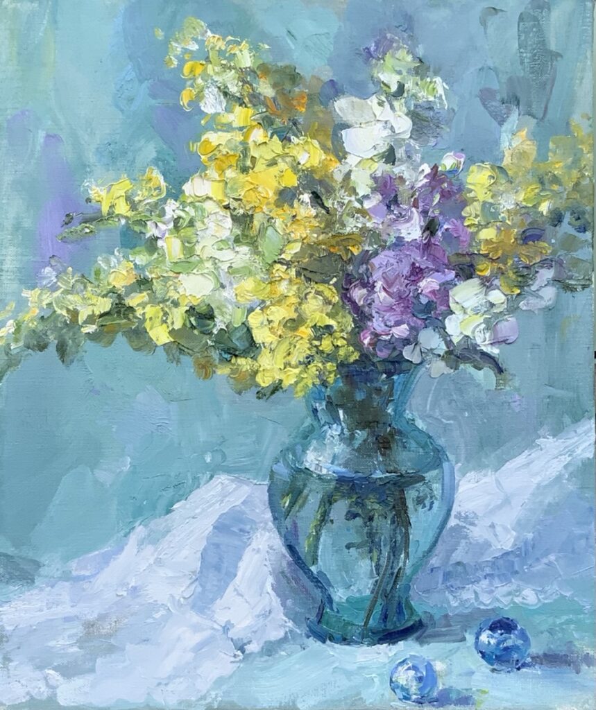 黄色だけではさすが色彩がもたないかなと思い、白と薄紫を加えて、全体的には、早春の冷たい清々しさと透明感を表現出来たらなぁと、四苦八苦しました。